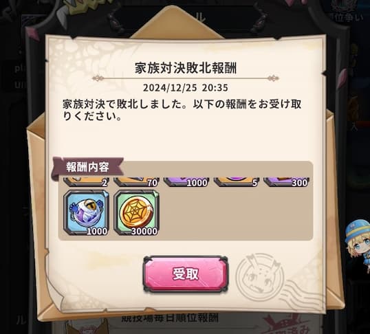家族対決(毎週火~金に毎日開催?)では勝つと1800、負けても1000と他のコンテンツと比べて破格の蜘蛛の繭がもらえます。