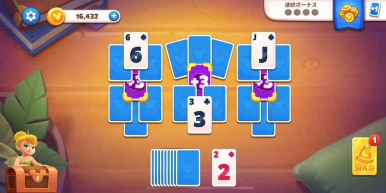 画像のようにトランプがちりばめられた状態から、隣同士の数字のカードを取っていってすべてのカードを取れたら1ステージクリアになります。