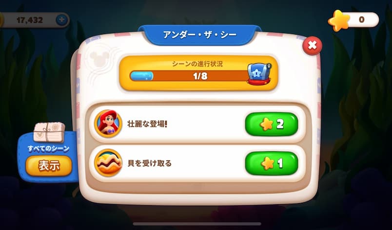 ☆をいくつか集め、すべてのストーリーを見終わるとシーン1つクリアです。
