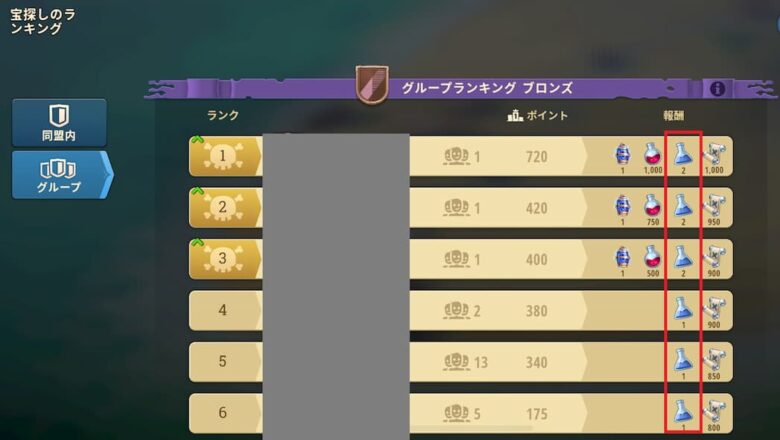ギルドに参加していると参加できる「宝探し」のボス討伐報酬、ギルド順位報酬でフラスコがもらえます。