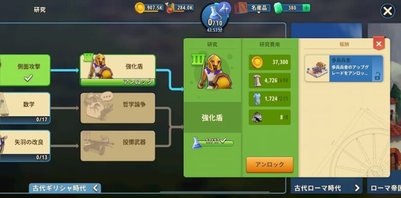 強化盾はゲーム内コンテンツ「研究」の中にあり、研究に必要なアイテム(フラスコ)が時間経過で貯まるしくみなので待ち時間が長い案件になります。