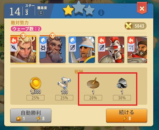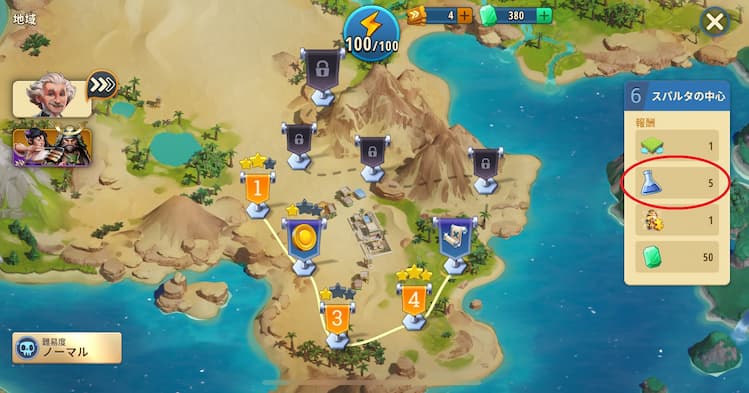 英雄たちを戦わせて領地を占領する冒険ステージの初回クリア報酬(一部ステージ、各エリア)でもフラスコがもらえます。