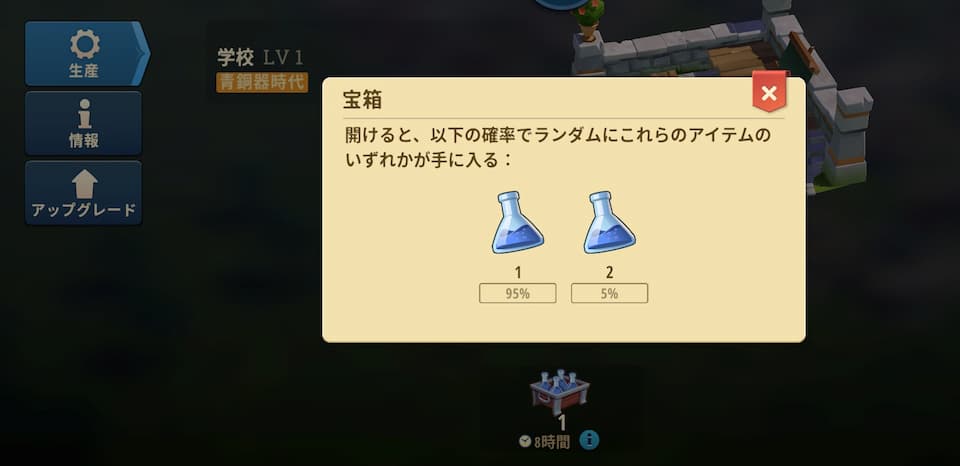 その中のひとつ、「学校」(かなり序盤に手に入りました)では8時間に1度フラスコが生産されます。個数は確率で1~2個。