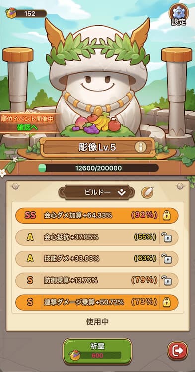 序盤は適当でもいいからお供え物を消費してキノコ彫像のレベルを上げ、ある程度上がったらステータスを意識してロックしたりしなかったり…。
