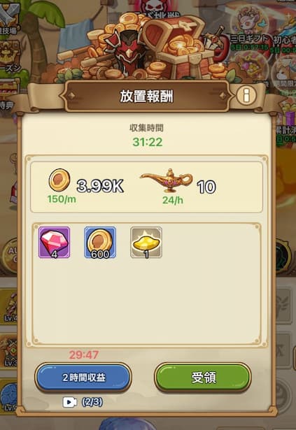 放置収益はMAX8時間ぶんまで蓄積されます。なるべく溢れないように受け取りましょう。