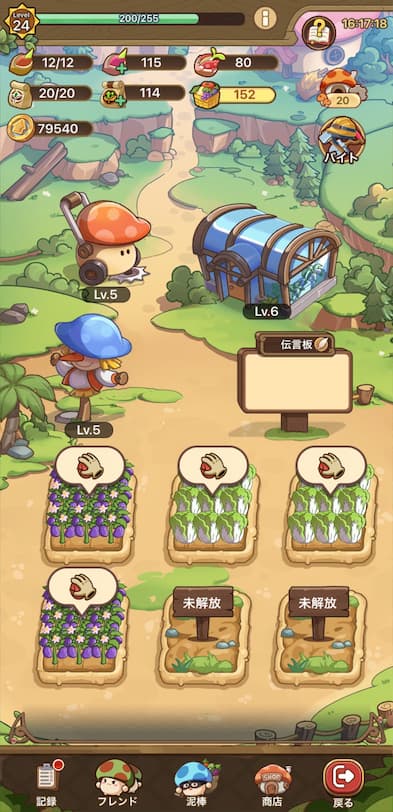 畑で作物を作り、得たお供え物を消費してステータスをアップさせます。