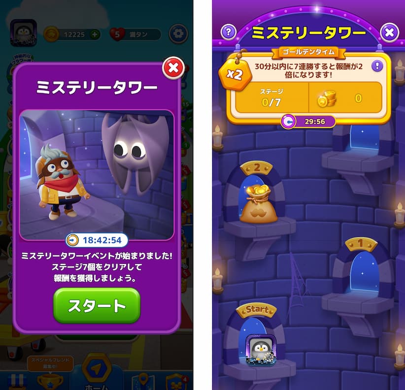 30分間プレイした合計スコア(?)を競ったり、連続で7ステージクリアすると報酬がもらえたり、ほかのプレイヤーより早く〇ステージクリア、のようなイベントが多めなので、