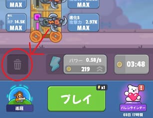 画像のごみ箱部分にタワーをドラッグするとタワーを廃棄できます。廃棄するとまた買い直すことができるのでスキルを厳選できる。